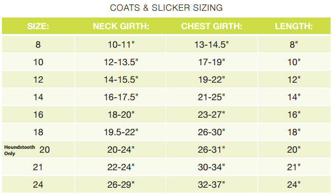 Our coats, slickers and sweaters are perfect for year round wear. No matter the weather, we have a stylish and comfortable option for every dog. And our wide variety of sizes will fit most dogs! Coats come in eight sizes: 8, 10, 12, 14, 16, 18, 21 and 24. All coats have a harness patch for attaching a leash. Sweaters are available in five sizes, XS through XL.