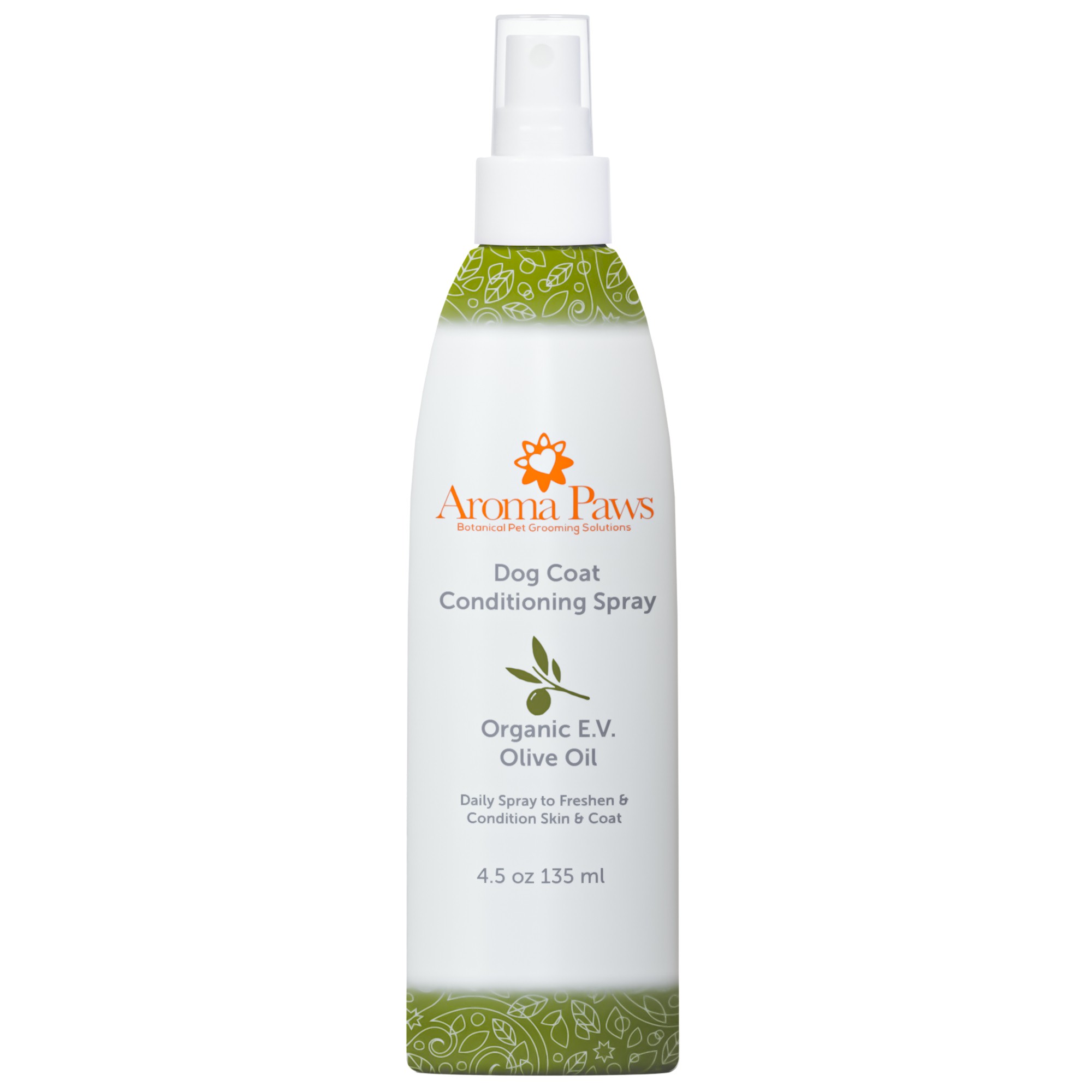 Aroma Paws Pet Coat Olive Oil Detangling Spray - a fragrance-free daily spray to condition your pet's skin and coat. This tangle remover conditions and loosens knots and tangles for easier brushing. Organic Extra Virgin Olive Oil conditions and smoothes the coat and helps detangle, while Organic Coconut Oil relieves itching of sensitive skin. Daily brushing reduces dirt and dander from your dog's coat. Simply spray Aroma Paws Dog Coat Conditioner liberally on your pet's dry coat and brush thoroughly to experience the full soothing and conditioning benefits. Avoid spraying in your pet's eyes, ears, and nostrils. For external use only.