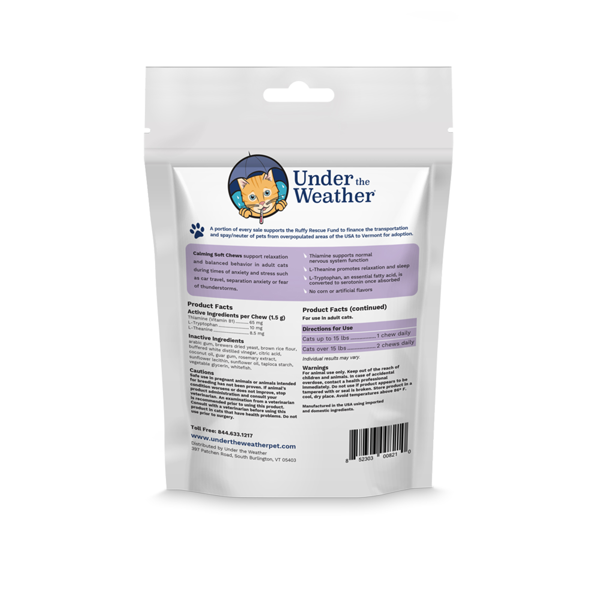 Our Calming soft chews support relaxation, balanced behavior and normal emotional balance in cats during times of stress, such as car travel and thunderstorms.Thiamine...