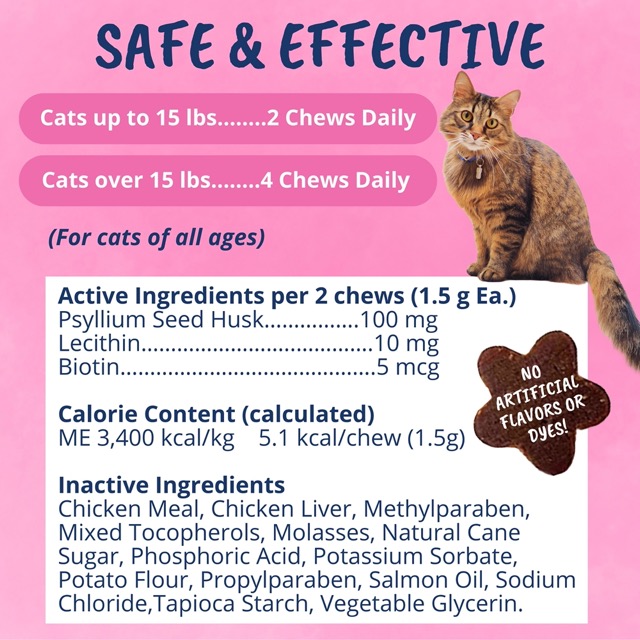 Our Hairball Support soft chews support normal, natural elimination of hairballs in adult cats. The Omega 3 fatty acids help to maintain healthy skin and coat.