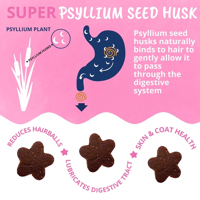 Psyllium Seed Husk provides natural fiber to help encourage efficient elimination of hairballs. Wild Alaskan Salmon yields Omega 3 Fatty Acids to maintain healthy skin and coat.