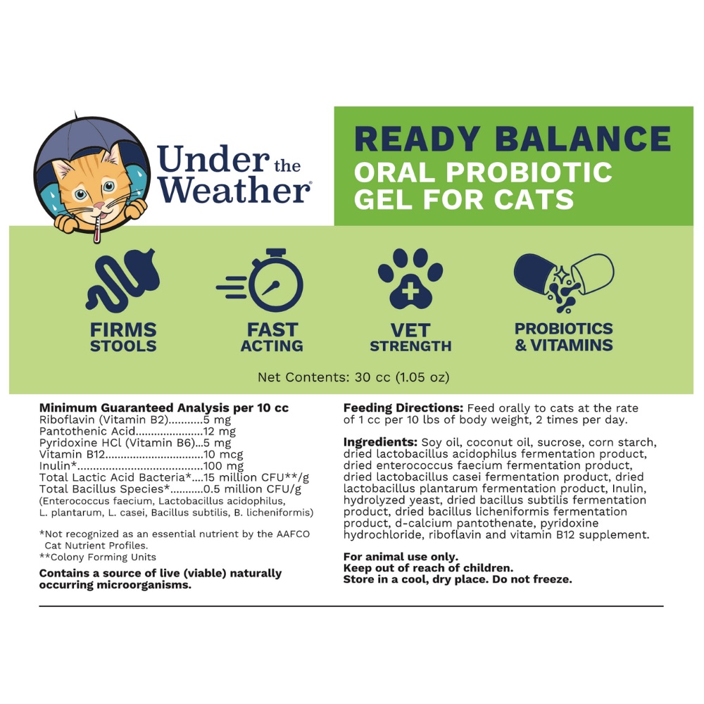 Ready Balance is a fast-acting oral probiotic gel used during times of digestive upset to support normal digestive balance. Ready Balance is a stabilized source of beneficial bacteria. It contains guaranteed levels of live (viable) probiotics, select vitamins and the prebiotic Inulin in a highly palatable gel base. When given as directed, Ready Balance helps maintain normal appetite, digestion and gut health during times of stress. Provide Ready Balance during travel, shows, breeding, birthing, lactation, kenneling, following antibiotic therapy and during times of digestive upset such as vomiting or diarrhea. The convenient dial-a-dose tube ensures accurate dosing levels. Cats love the taste of this gel!