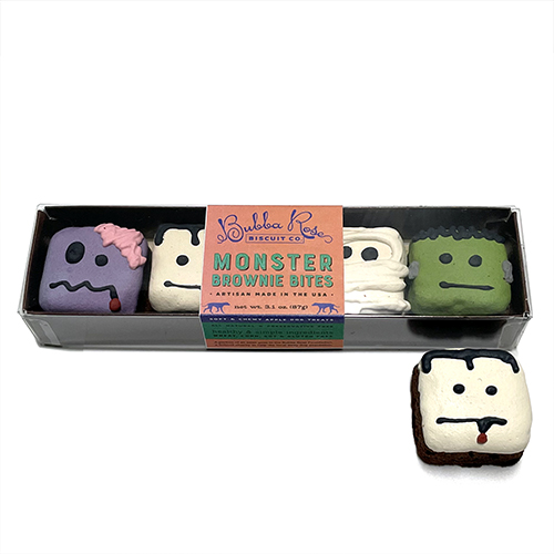 Our monster brownie bites, in a ready made gift box! These are a densely chewy texture (think biscotti/day old brownie combo) and made with our peanut butter apple cake recipe. They're a dog favorite. Colors can be assorted.