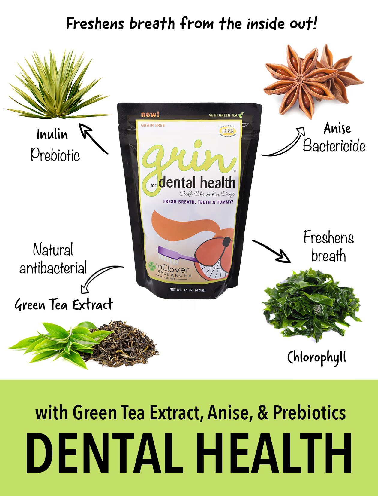 Grin® contains powerful active ingredients, including green tea and chlorophyll to fight plaque, tartar and bad breath at the source.