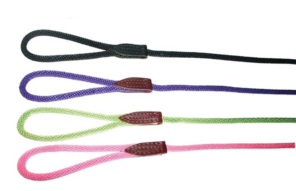 Available in many colors, this lead is 3/8 inch in diameter. The British Rope Slip Lead is strong but soft and light enough for (almost) any dog! Recommended for dogs over 5 pounds.