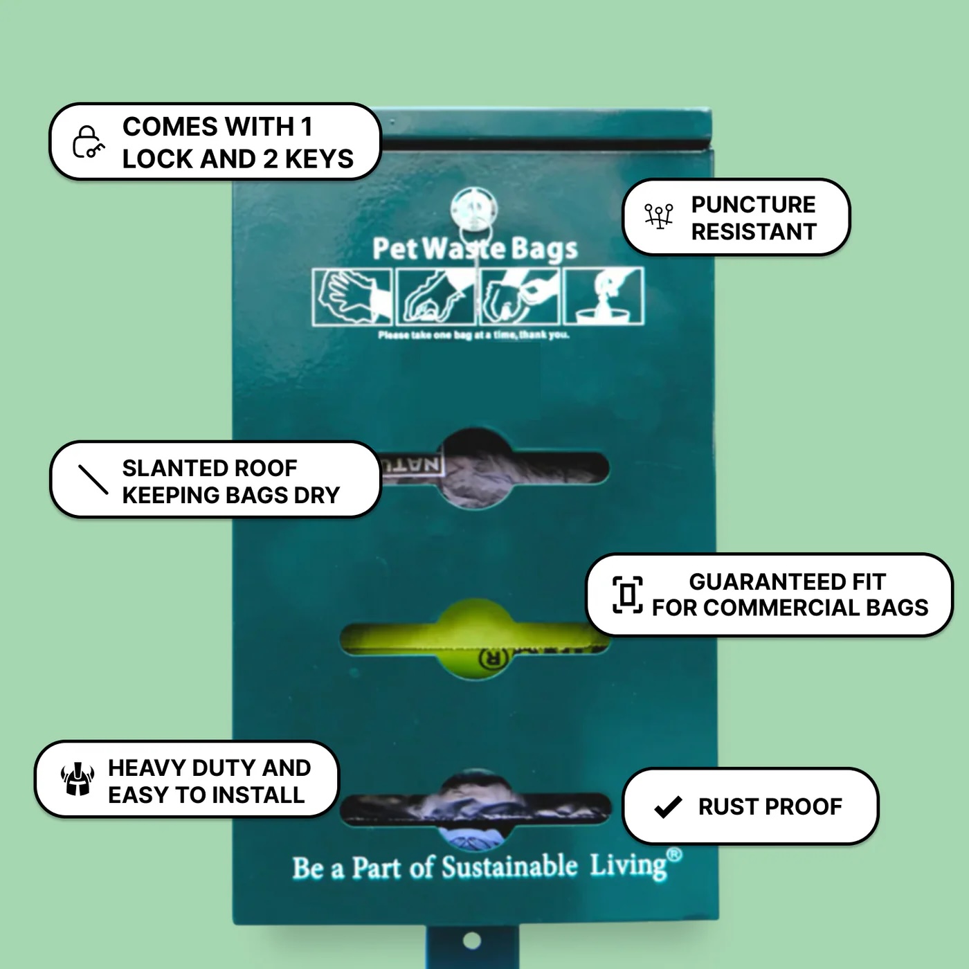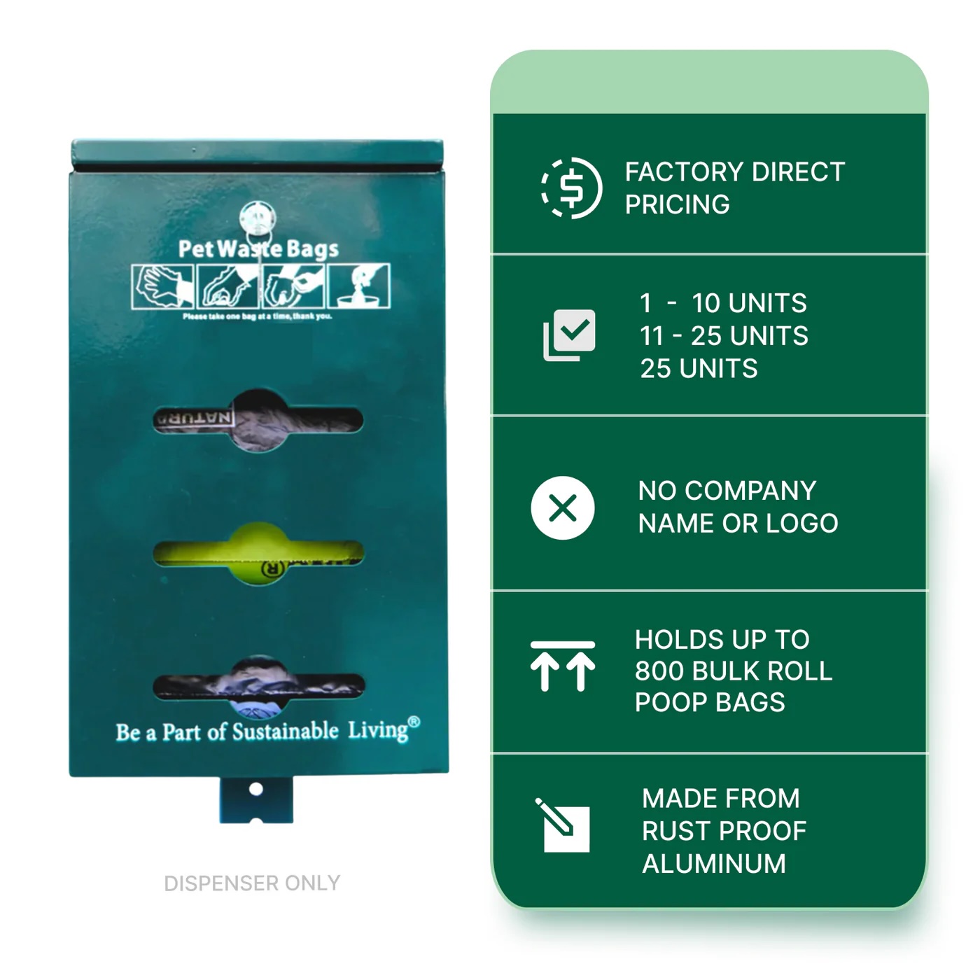 Made from heavy-duty rust-proof aluminum, this bulk roll dispenser holds up to 800 poop bag rolls. Includes a secure lock with two keys, slanted roof to keep rain out, and a puncture-resistant build. Ships free with our best price guarantee. No branding or logo included.