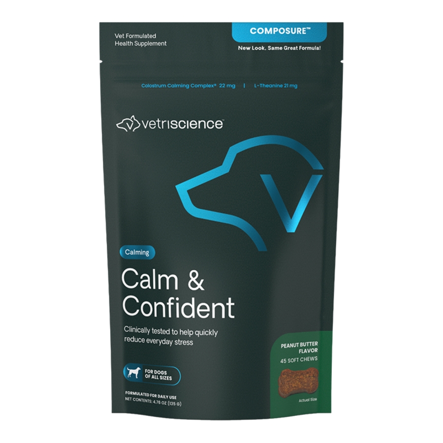 Composure™ is a fast-acting formula that promotes calm behavior in dogs that are anxious or stressed. It’s great for thunderstorms, fireworks, traveling, vet visits, routine changes and more. Composure™ is clinically shown to work within 30 minutes and last up to 4 hours.* Since Composure is a supplement, it’s suitable to double or triple your dog’s dose during times of added stress. Our unique formula features extensively researched ingredients that help your dog remain calm without harmful side effects.Patented Colostrum Calming Complex® Biopeptide Blend, Thiamine (Vitamin B1) and L-Theanine work together to support balanced behavior and a relaxed state of mind. These ingredients have been shown to help reduce stress and unwanted behavior. Composure™ is made with naturally sourced ingredients in a delicious bite-sized chew that dogs love!