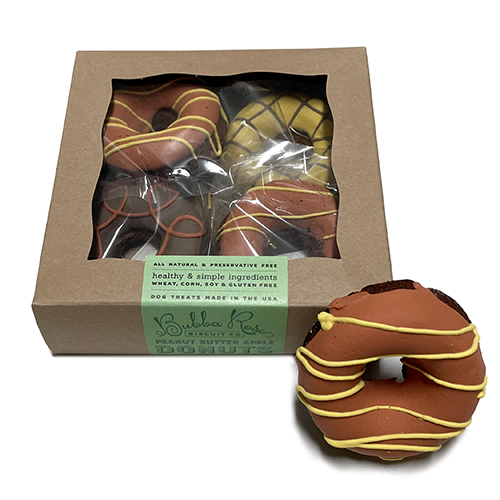 Our fall donuts are soft (densely chewy like a day old brownie) and made from our well loved peanut butter apple cake recipe. A dog favorite! Each donut is individually wrapped inside the box, making serving over time no problem. Assorted.
