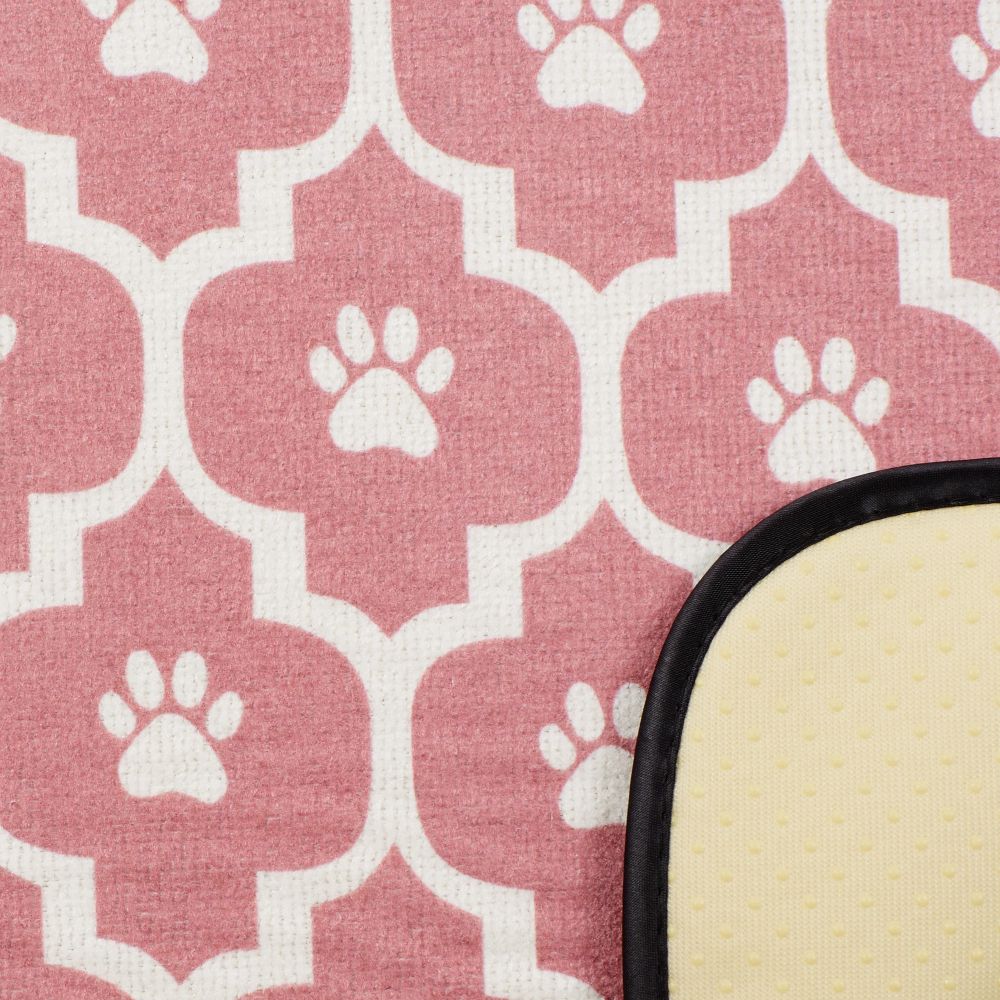 This food mat absorbs water slop, splashes, food stains or spill, protects your carpets and hardwoods. The non-slip back surface prevent it from sliding across smooth surfaces.