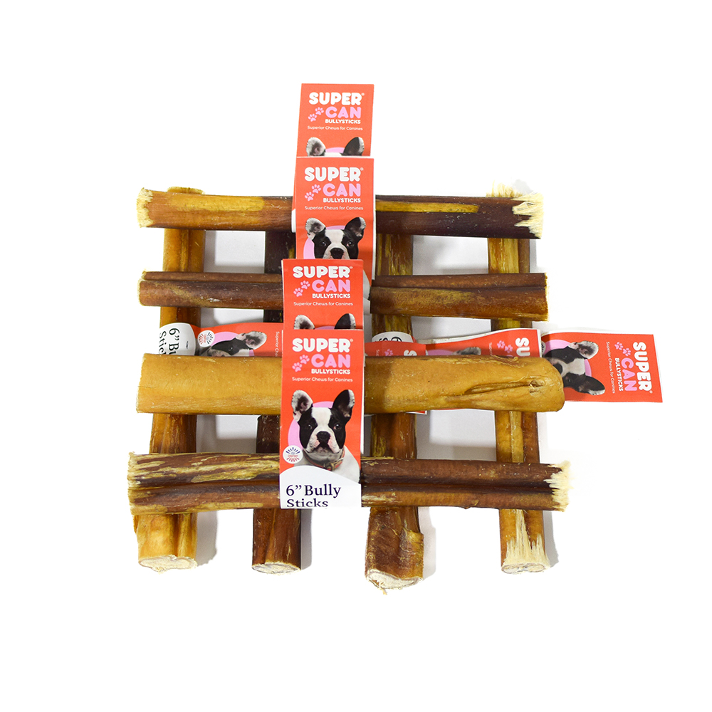 6" Jumbo Bully Sticks. 100% Natural Free Range Grass Fed Beef Sticks. Made, inspected and packaged at our Food Graded Facility.