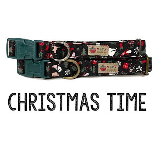 This collar is adorned with a black cotton covered with mini Christmas Santa’s, trees and other cuties! As always, this fun fabric covers our unique organic cotton webbing! :)