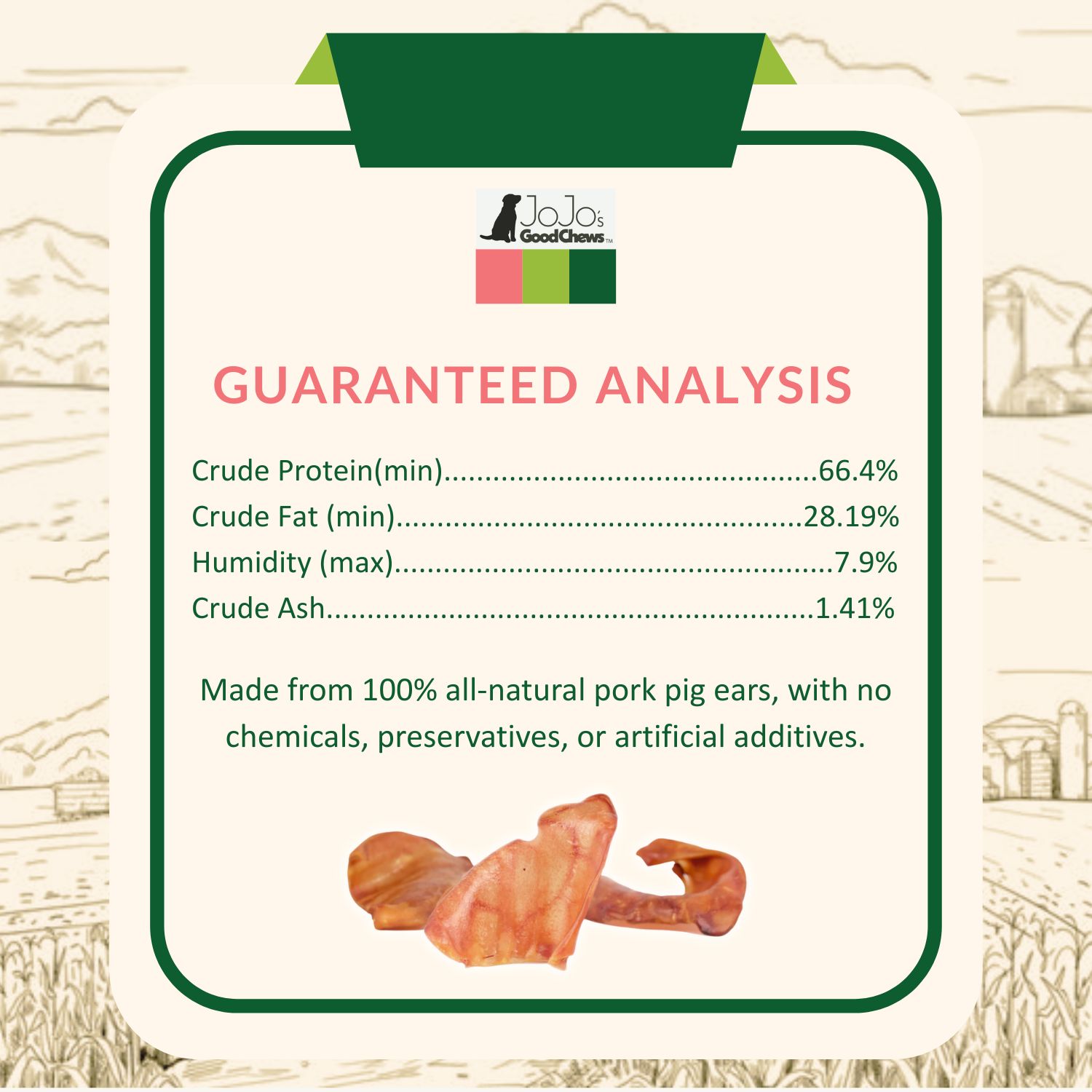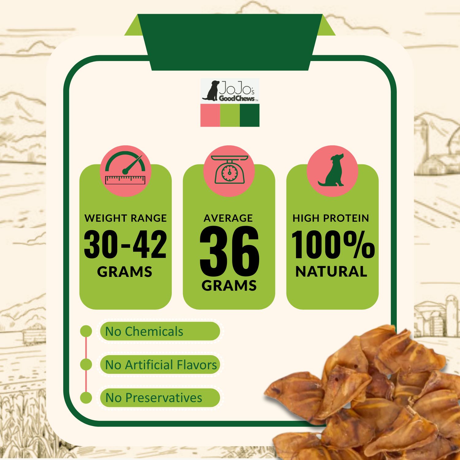 Elevate your product lineup with our Whole Pig Ears, available in packs of 25 all-natural dog chews. Crafted from 100% natural pork, these treats are tailored to satisfy dogs of all breeds and sizes.