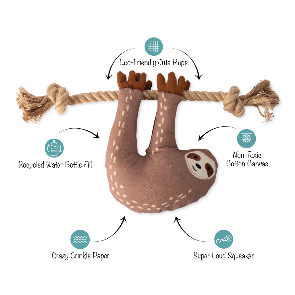 MADE WITH RECYCLED AND NATURAL MATERIALS AND FILLED WITH SPUN RECYCLED WATER BOTTLE FILLING. FEATURING NON-TOXIC CANVAS AND ECO-FRIENDLY JUTE ROPE WITH AN EXTRA LOUD SQUEAKER, CRINKLE PAPER, AND TPR SPIKEY SQUEAKER BALL INSIDE. TOY COMES ATTACHED TO A BACKER CARD.