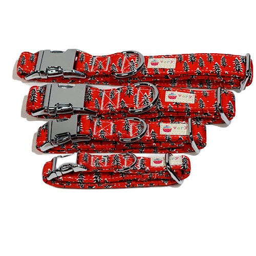 This particular collar is in a Christmas red with green pine trees covered in a bit of snow! The hardware is a luxe and heavy duty shiny silver!