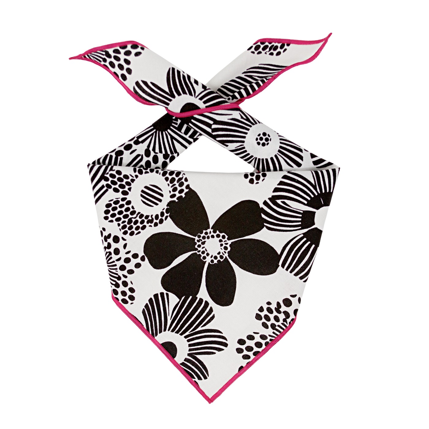 Crisp Cream Cotton with "Flower Power" Print, Hot Pink Rolled Hem make this a Beautiful Spring or Summer Bandana
