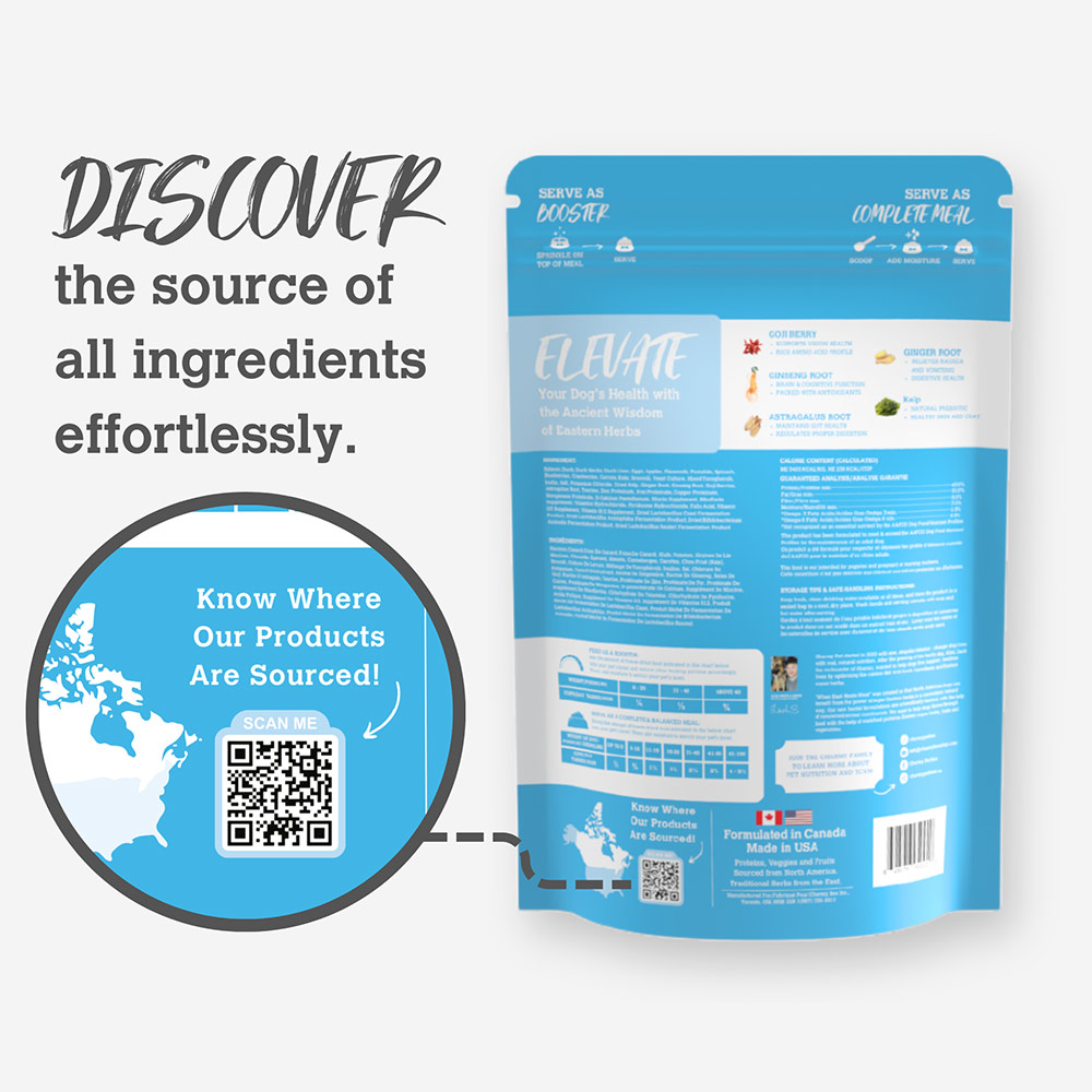 Introducing ‘When East Meets West’ Freeze-Dried Raw Herbal Dog Food - a nourishing blend of 90% Salmon, Duck, Duck Necks and Duck Liver, combined with 10% of the finest fruits, vegetables, and Eastern-Super Herbs. Our carefully crafted recipe is designed to empower your furry friend with the essential nutrients they need to live a long and happy life by your side.