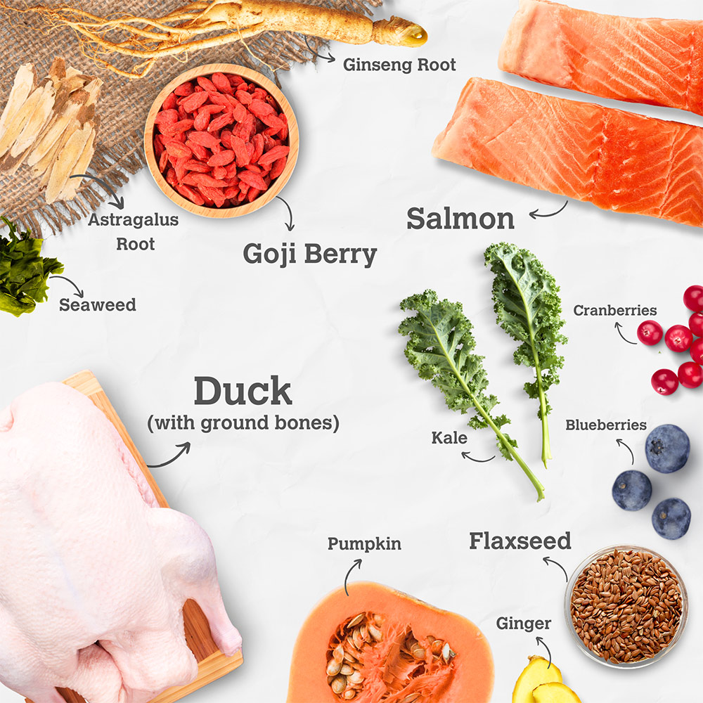 Salmon, Duck, Duck Necks, Duck Liver, Eggs, Apples, Flaxseeds, Pumpkin, Spinach, Blueberries, Cranberries, Carrots, Kale, Broccoli, Yeast Culture, Mixed Tocopherols, Inulin, Salt, Potassium Chloride, Dried Kelp, Ginger Root, Ginseng Root, Goji Berries, Astragalus Root, Taurine, Zinc Proteinate, Iron Proteinate, Copper Proteinate, Manganese Proteinate, D-Calcium Pantothenate, Niacin Supplement, Riboflavin Supplement, Thiamine Hydrochloride, Pyridoxine Hydrochloride, Folic Acid, Vitamin D3 Supplement, Vitamin B12 Supplement, Dried Lactobacillus Casei Fermentation Product, Dried Lactobacillus Acidophilus Fermentation Product, Dried Bifidobacterium Animalis Fermentation Product, Dried Lactobacillus Reuteri Fermentation Product