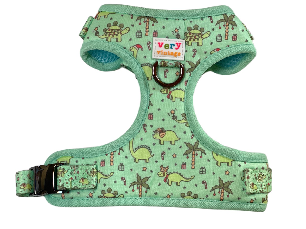 Light Green Christmas Dinosaur Pattern. Eco-friendly Dog Harness Vest. High Quality. Metal Hardware.