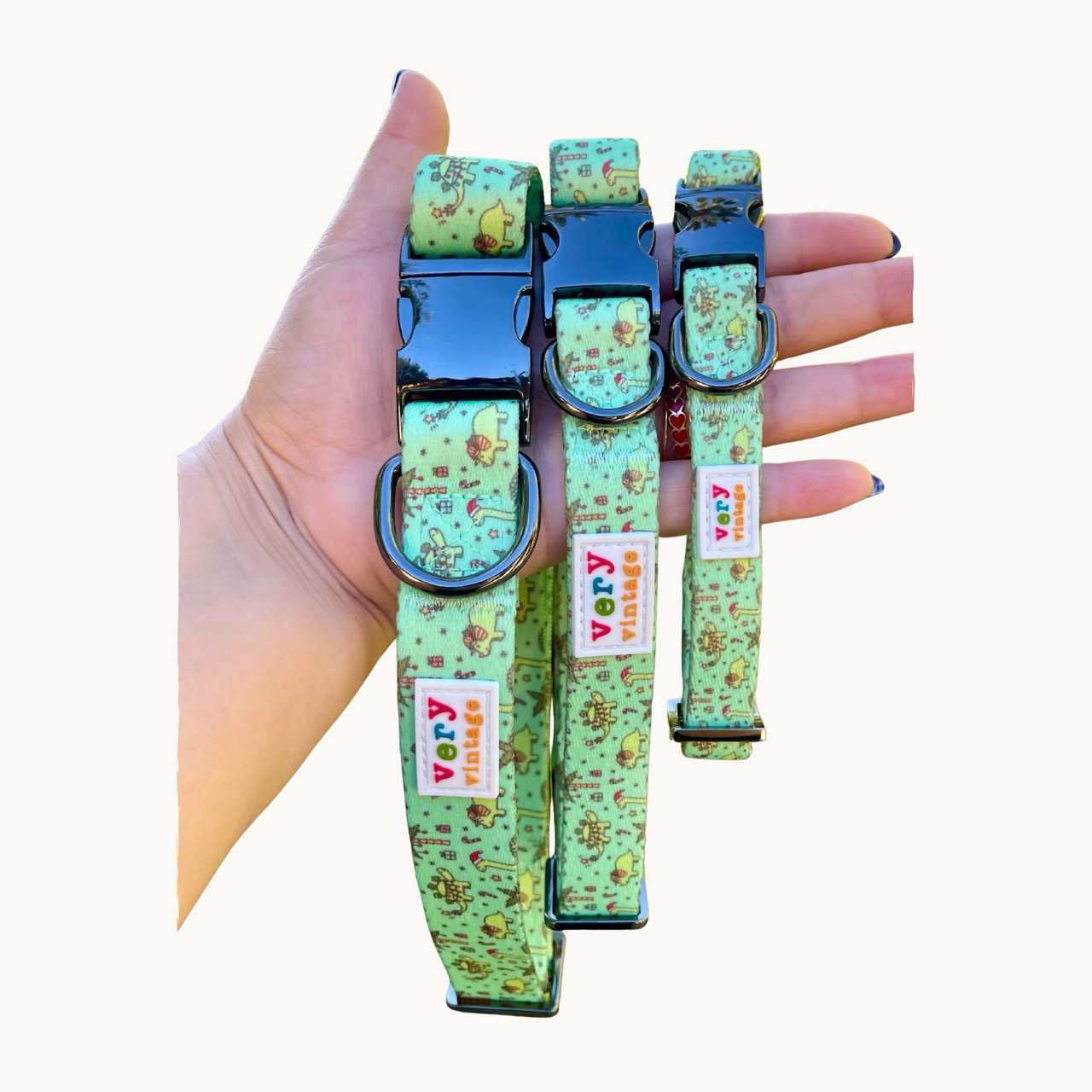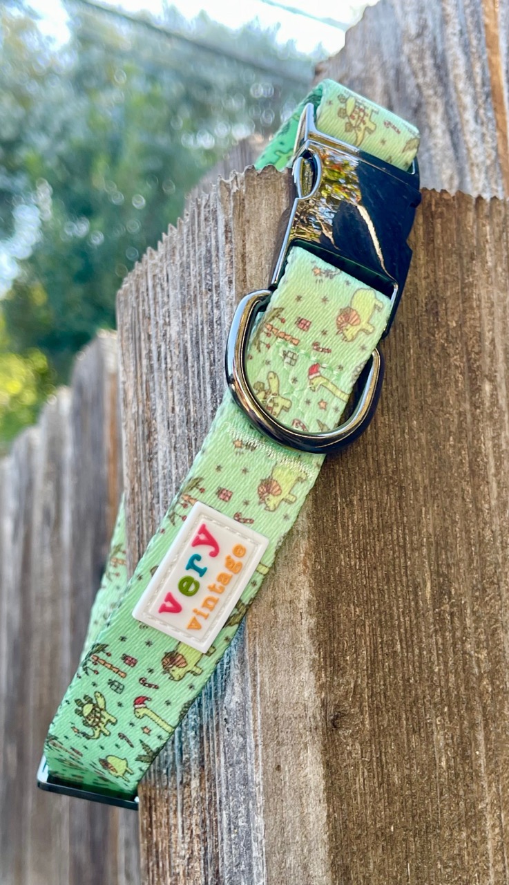 Make spirits (and tails) bright with our Festive Dinos Dog Collar! 🎁💚 This adorable green print features cheerful dinosaurs decked out for the holidays — complete with scarves, candy canes, and Santa hats. Made from recycled polyester and finished with sleek gunmetal hardware, this collar is as sturdy as it is cute.