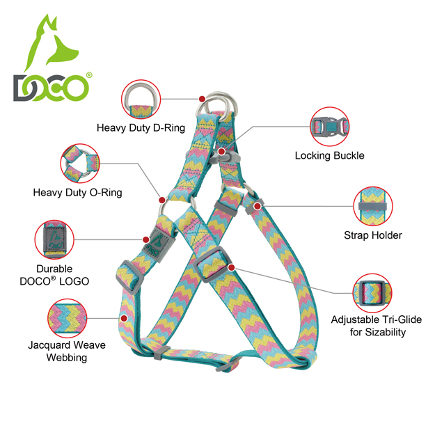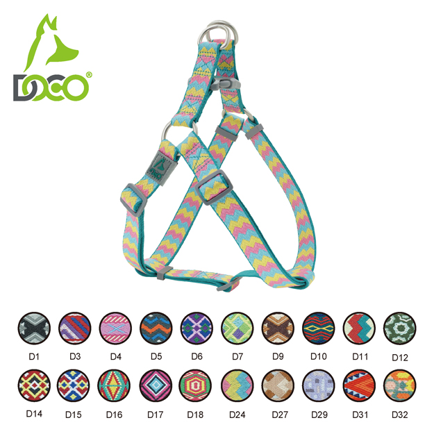The DOCO® Jacquard Weave Harness ensures a more comfortable fit, effectively distributing pressure around your dog's neck to facilitate easier training and outdoor adventures. It features a locking button for enhanced security and an adjustable tri-glide for a customized fit. The harness is designed to provide a cozy fit between your dog's chest and the harness itself. With two metal D-Rings for secure leash attachment, your pet is ready for any adventure. Choose from 20 stunning jacquard patterns to suit your pet's style, and don't forget to complete the look with the matching leash!