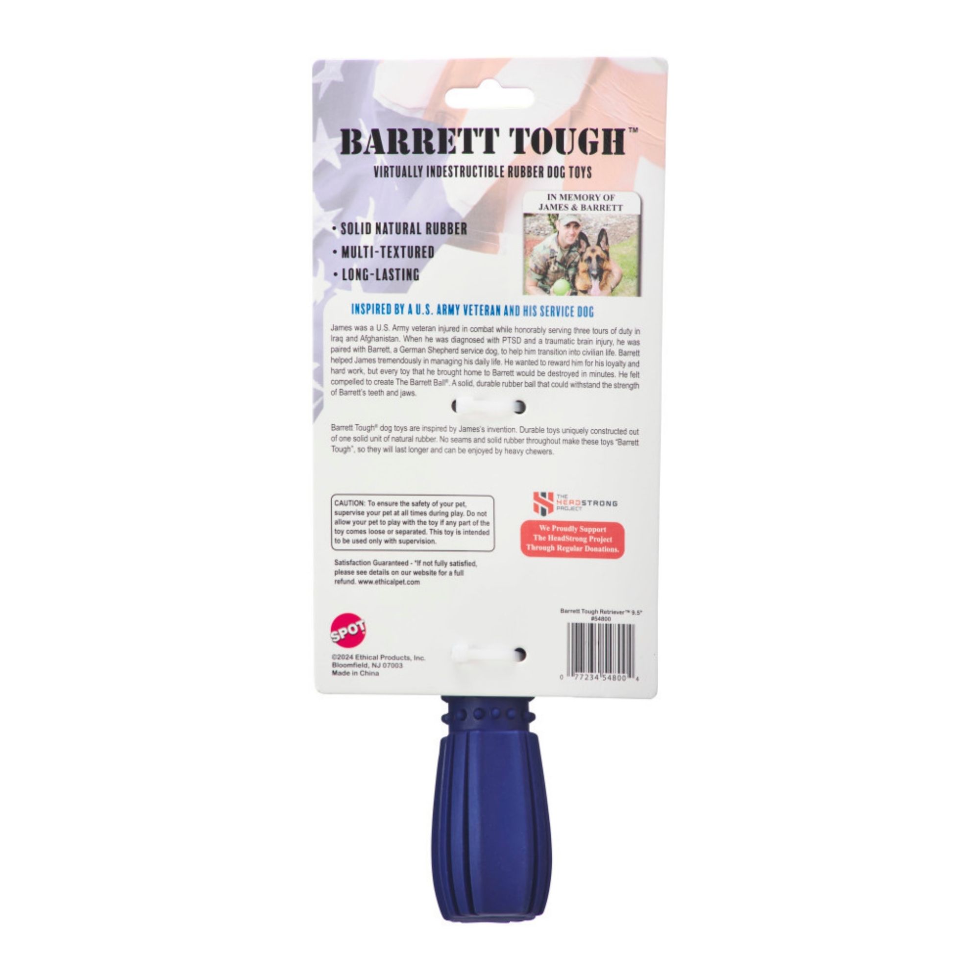 The Barrett Tough Retriever is perfect for medium sized dogs. Designed of solid natural rubber with a textured surface that will massage teeth and gums for a healthy mouth. Virtually indestructible and long lasting for hours of interactive play time. In memory of James and Barrett we proudly support The Headstrong Project through regular donations.