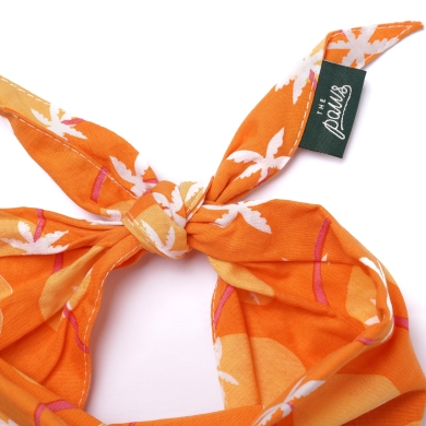 Dreamland - palm trees at the beach on a vibrant sun-bright orange day. Tailor cut dog bandanas, sized & ready to wear.