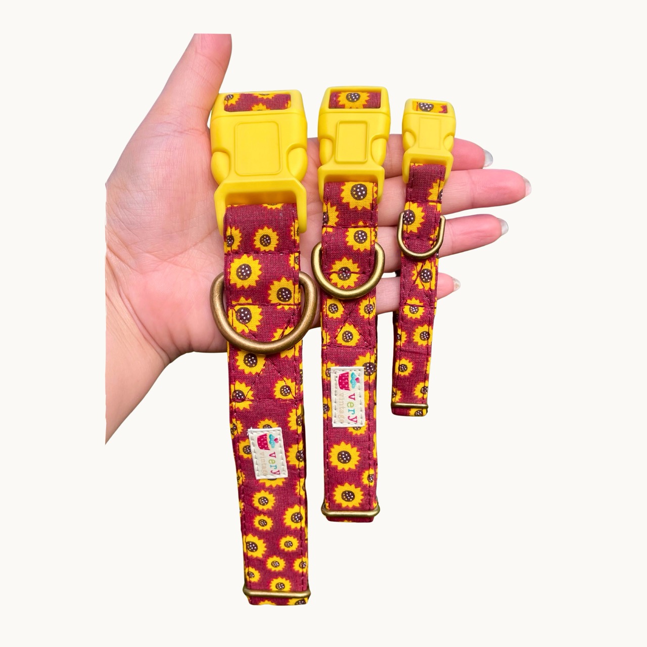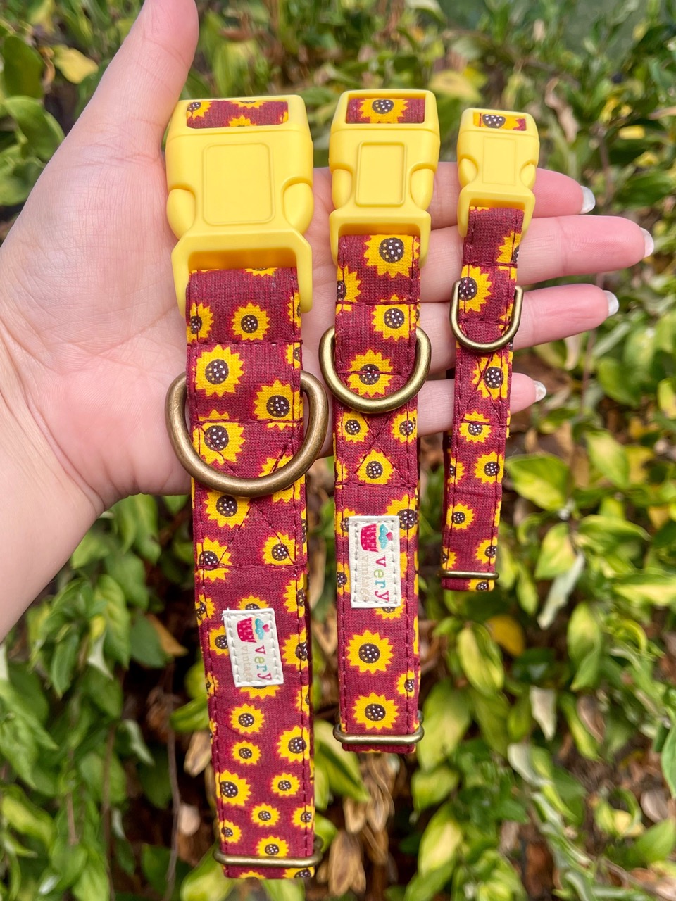 Bring a little sunshine wherever your pup goes with our Sunflower Field dog collar! 💛🌻 Featuring golden sunflowers on a rich maroon background, this cheerful design radiates warmth and charm - perfect for late summer strolls and fall adventures alike. Handmade from 100% cotton layered over organic cotton webbing, it’s durable, soft, and delightfully vibrant.