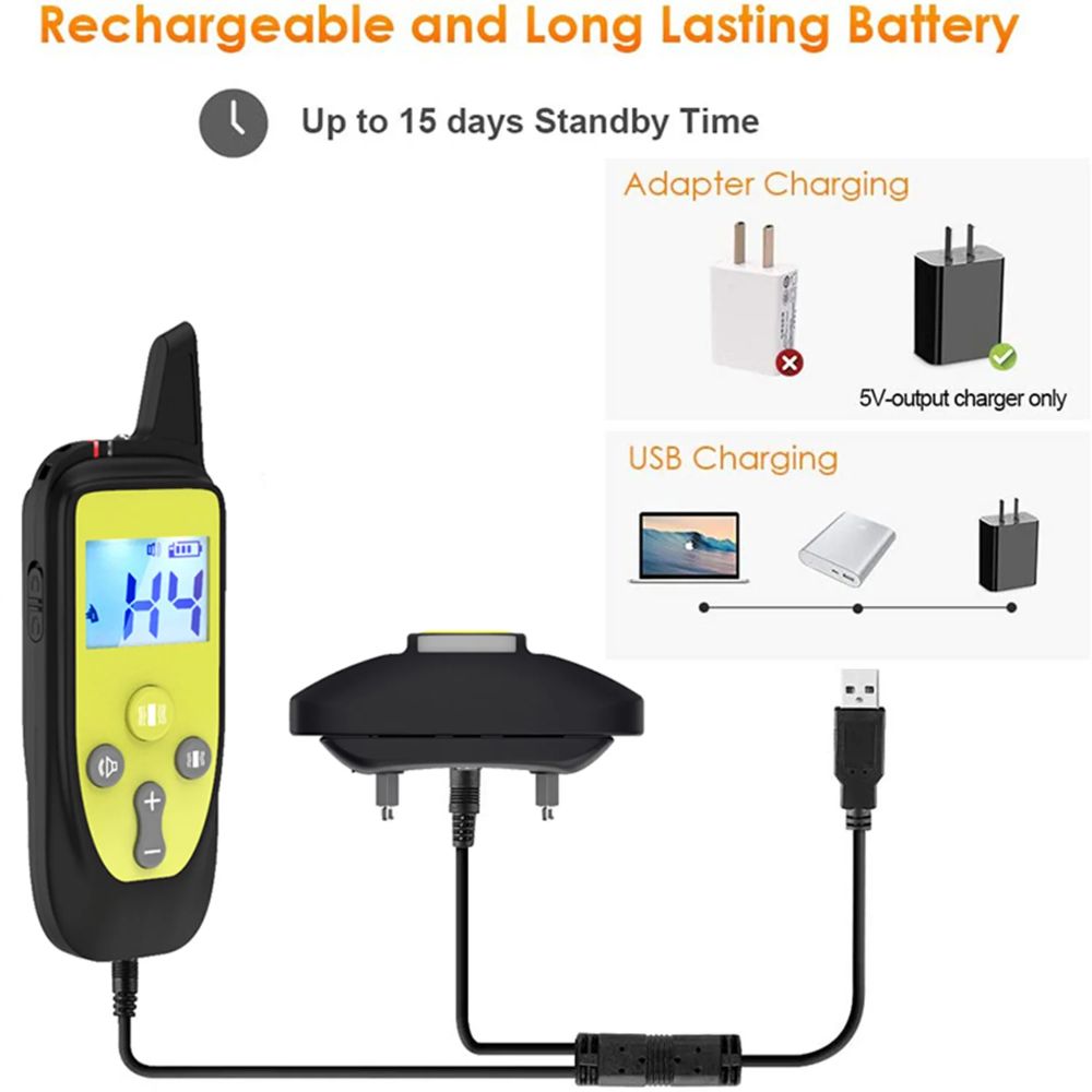 The Pet Life ® Yard-Trek 1-to-2 Dog 550 Yard Range 16-Level Vibration and Sound Training Dog Collar provides range of approximately 550 Yards 1650 Feet and is Non-Shock or a safer alternative to E-Shock with 2 channels that allows training of upto 2 dogs (Additional Receiver sold seperately). The Transmitter provides 3 modes that includes 16-Levels of Vibration, 8-Levels of Sound, with simultanious Sound and Vibration that simply activates at the press of a button. The intensity levels are adjusted by the up and down button located on the Transmitter for easy adjustment. Additionally, the Transmitter features an LCD Display screen that displays intensity levels, battery life, and channel identifier with a toggle switch and an On and Off Safety switch that prevents accidental usage when carrying. Features an automatic wireless detection option that when enabled activates once your dog is out of range. Includes a Dual-USB charger that can charge both the Receiver and Transmitter in 2-3 Hours for upto 15 Days of Standby time usage with over-charge voltage protection and further includes 4 Metal Prongs and covers for Short and Long-Hair dogs and a wrist-band. The Transmitter fatures a slim design for easy carrying. The Receiver and Transmitter feature IP67 Waterproof Rating. The durable nylon dog collar or receiver is designed to fit neck-girths ranging from 6.5 - 24 Inches.