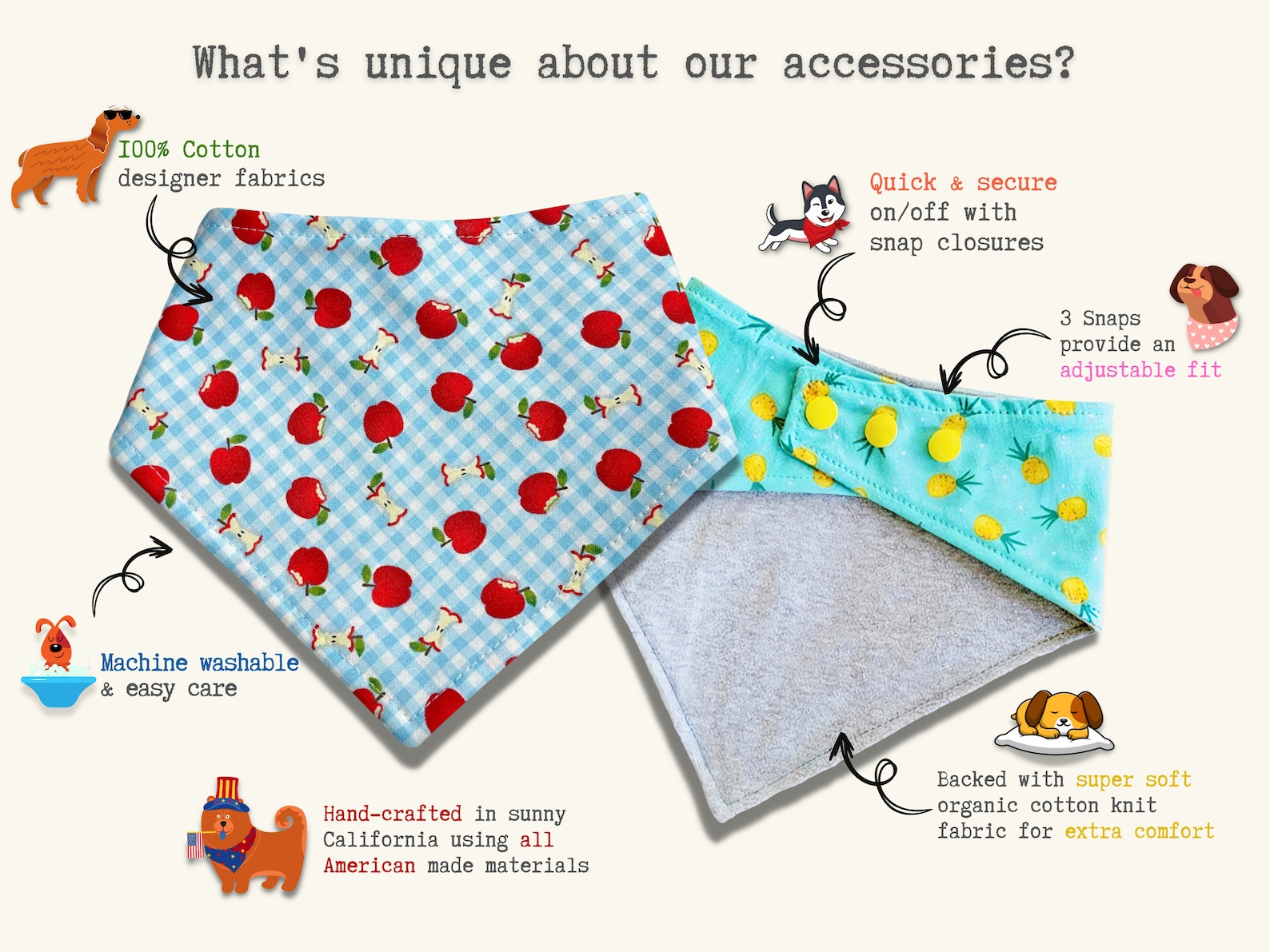 Our cotton knit backing is eco-friendly and soft and helps keep its shape and holds up better in the wash and around your pups neck, than other bandanas!