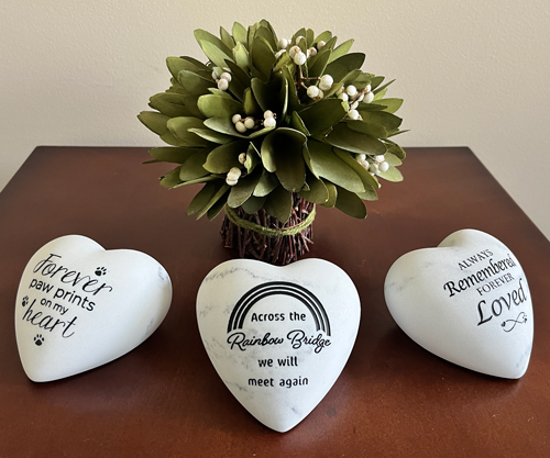 Our fur family leaves a lasting impression of love on our hearts. These Memorial Heart Stones capture the lasting heartfelt memory of pets who have passed. Each Memorial Heart Stone measures approximately 2.5” H x 4” W x 4” D