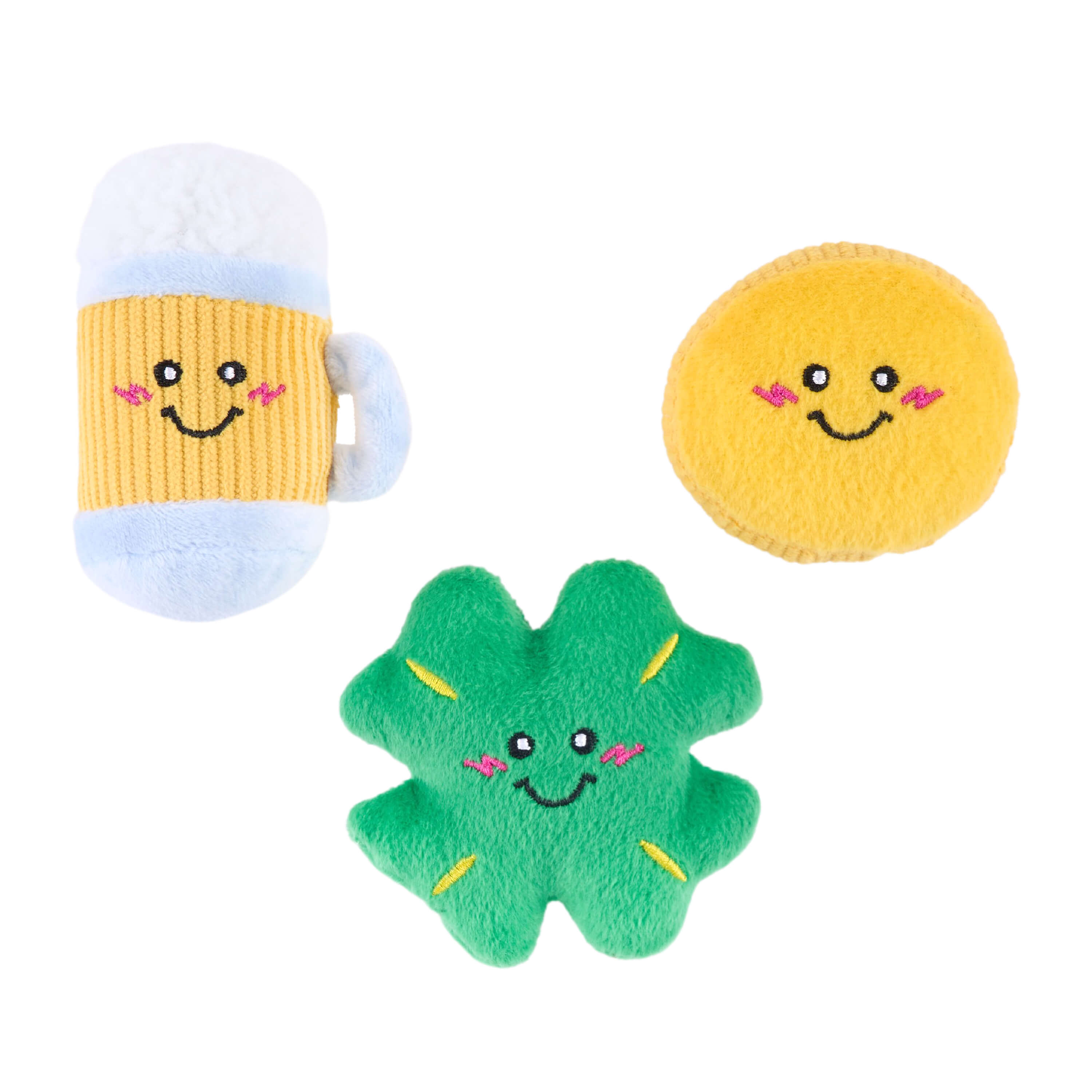 Includes Four Leaf Clover, Pot of Gold, Beer, Donut, Coin, and Horseshoe Miniz. 1 round squeaker in each. Assorted fabrics, crinkle, and embroidered details.