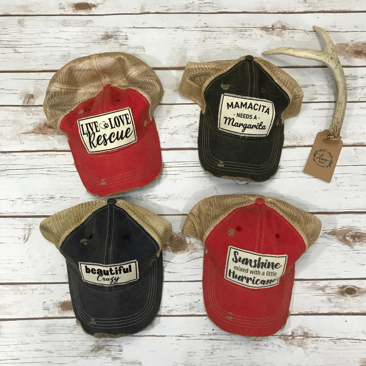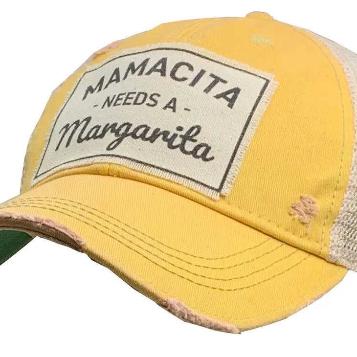 DetailsVintage Distressed Trucker Cap "Mamacita Needs A Margarita"Color: Yellow Distressed Material: Cotton/Polyester blend, Mesh backSize: One...
