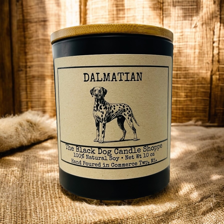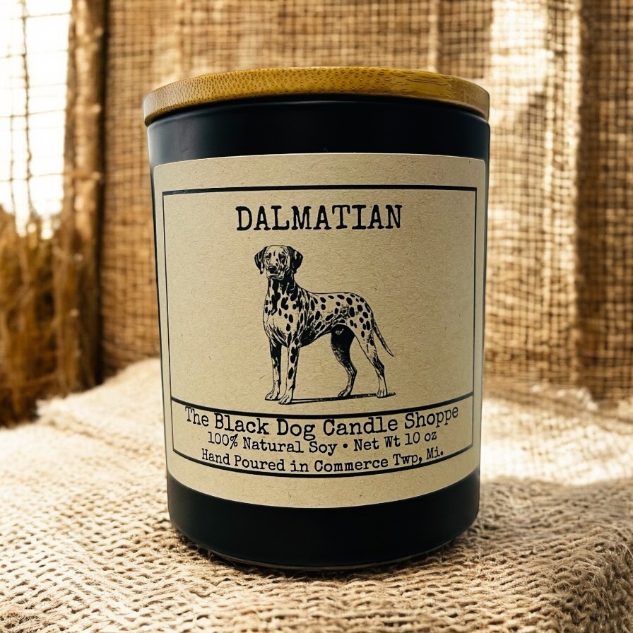 Black vessel with kraft colored label with vintage type Dalmation Dog.  Available in a variety of scents.