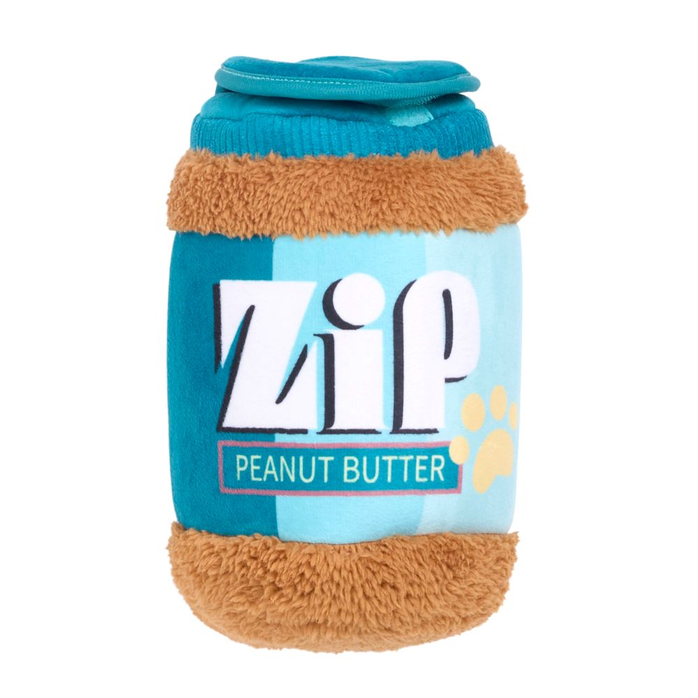 The Bungee Burrow Peanut Butter Jar features Peanut Miniz. Includes 2 Miniz with 1 round squeaker in each that are attached to Burrow jar via bungee cord. Lid features a hook and loop closure to add to the challenge of reaching the Miniz. Embroidered and printed details. Contains stuffing.