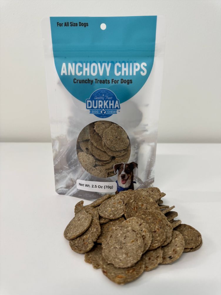 Durkha Anchovy Chips Dog treats come in a bag. They are delicious, healthy, and all-natural single ingredient treats. Our fish treats are naturally sourced...