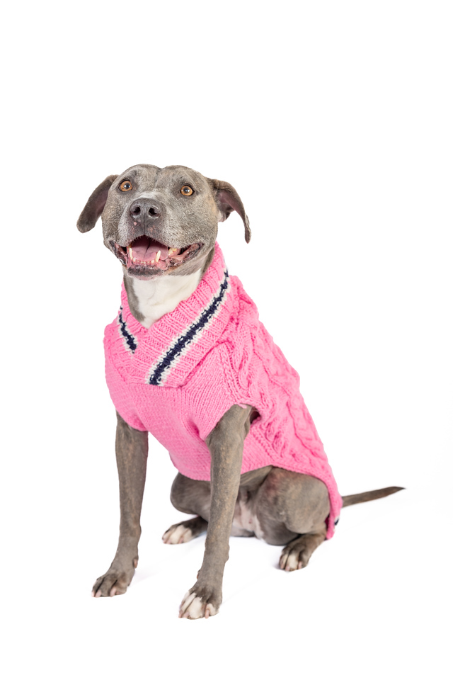 The Preppy Pink Cable Knit dog sweater design was inspired from the beautiful colors of pink and navy trim.