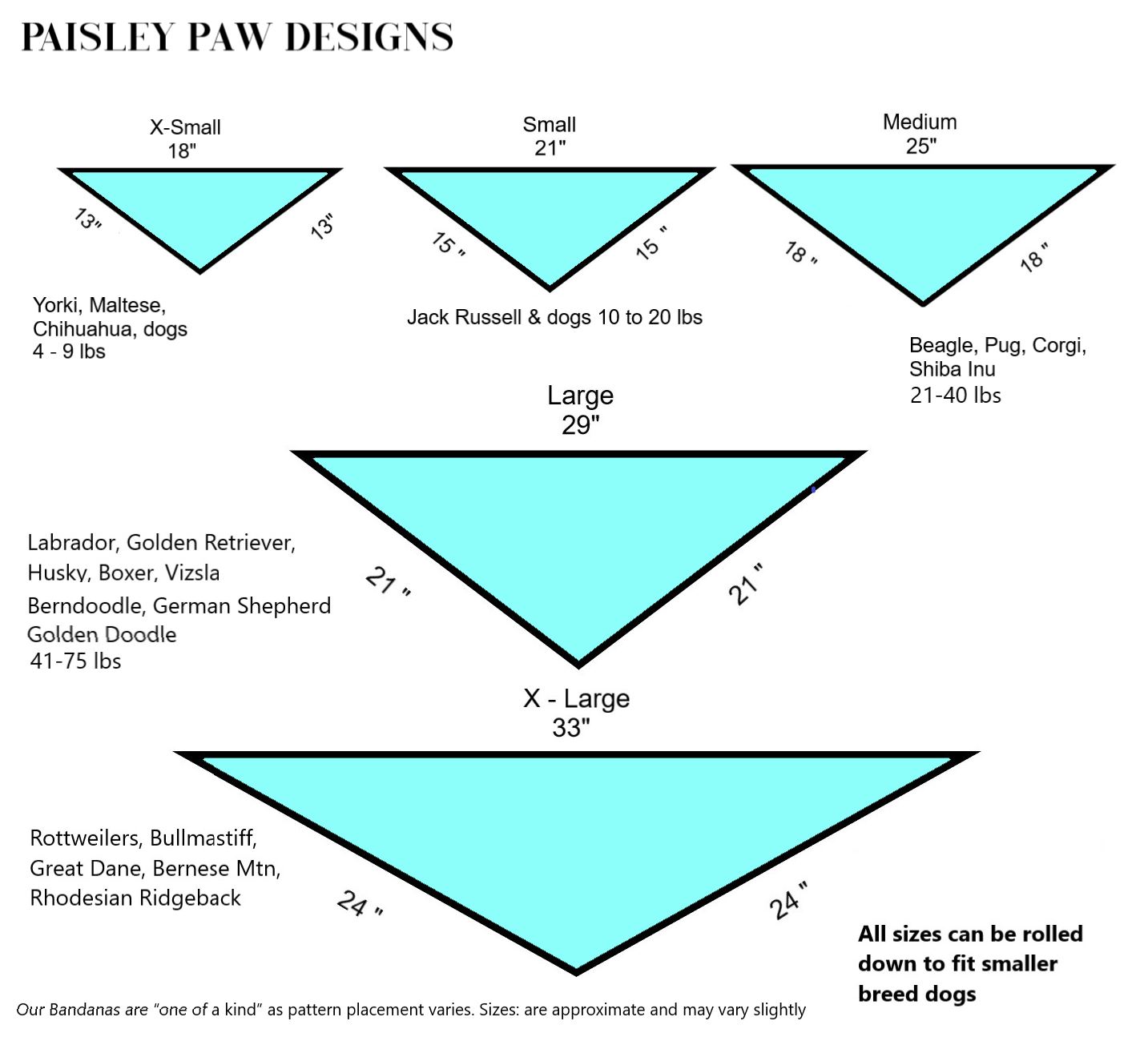 Paisley Paw Designs Dog Bandanas are handmade in the USA with attention to every detail. Lightweight - just tie around your dogs neck, dogs don't even notice they're wearing it.