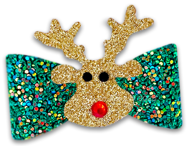 Glittery green bow topped with a gold reindeer and a red nose. This festive sparkle is ready to sleigh all season long! Standard size, approx. 2' wide; stiffened for extended wear.