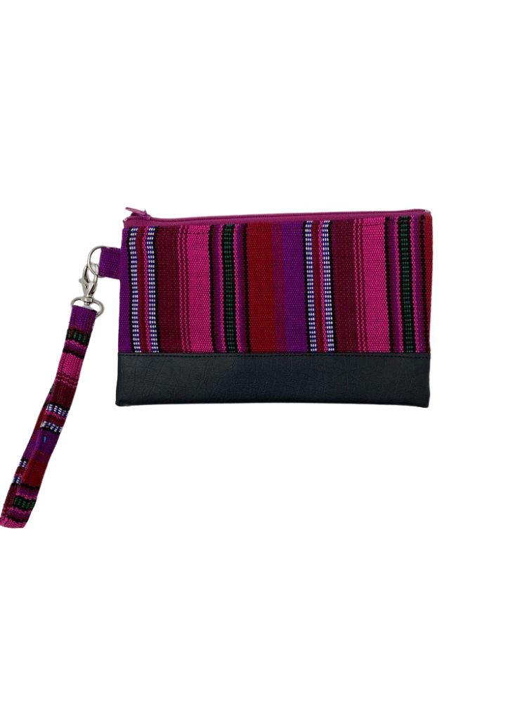 Approximately 8” wide x 4 ¾” tall with 6” loop strap Made out of handwoven cotton + vegan leather. zipper closure