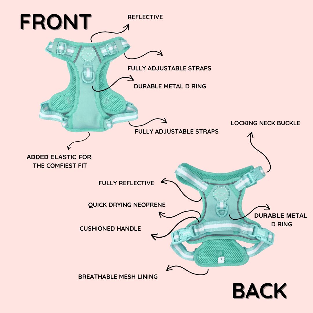 The harness comes with a convenient handle that makes it easy to help your dog up and down, into and out of the car or guide them over obstacles. Pair the harness with the matching leash, collar, and poop bag accessories for a complete and stylish look that will have heads turning.
