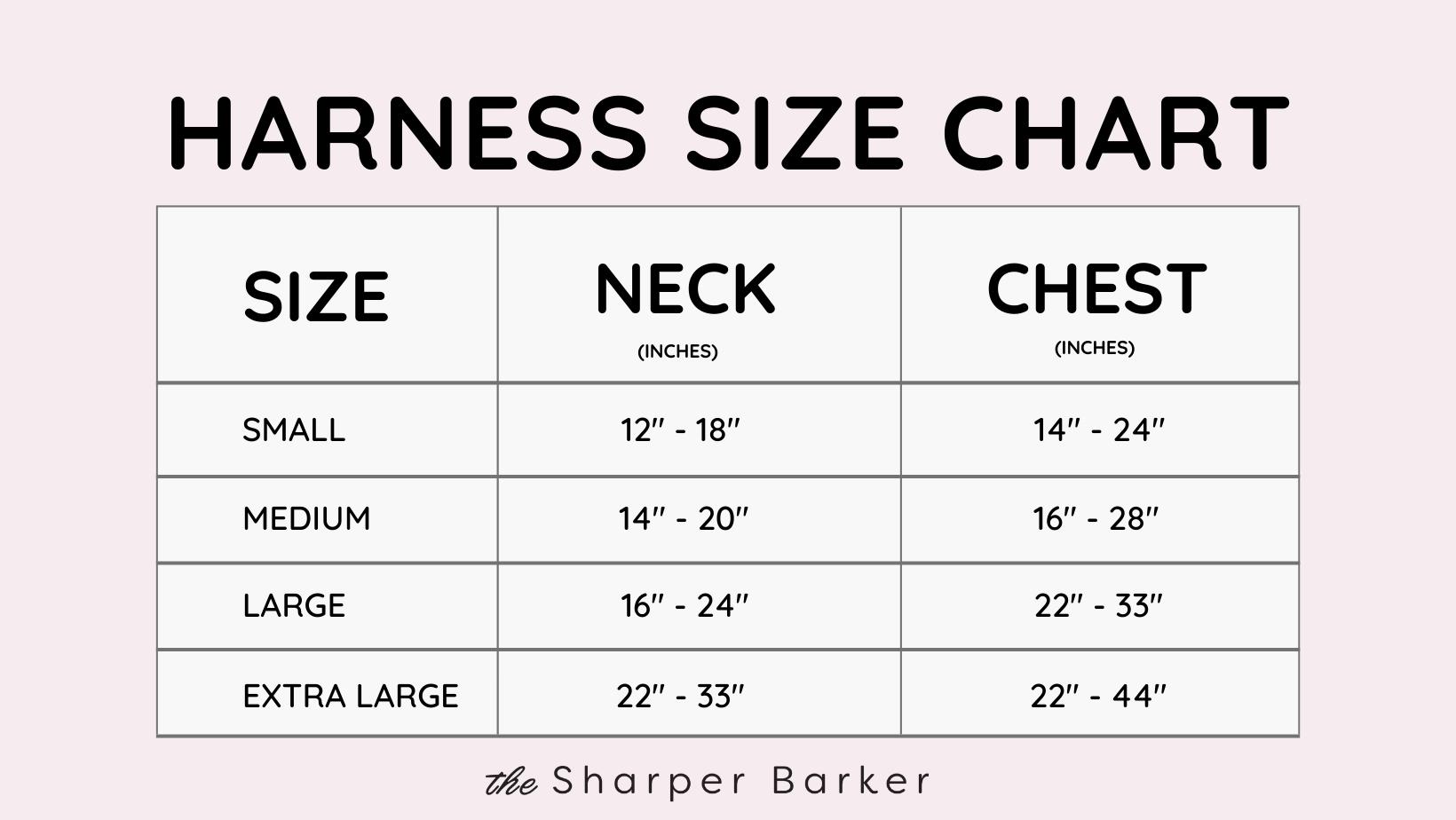 See size chart below. Note, these are the actual measurements of the harness. Make sure to leave enough room for comfort.