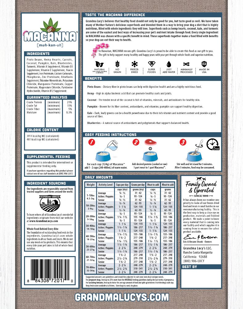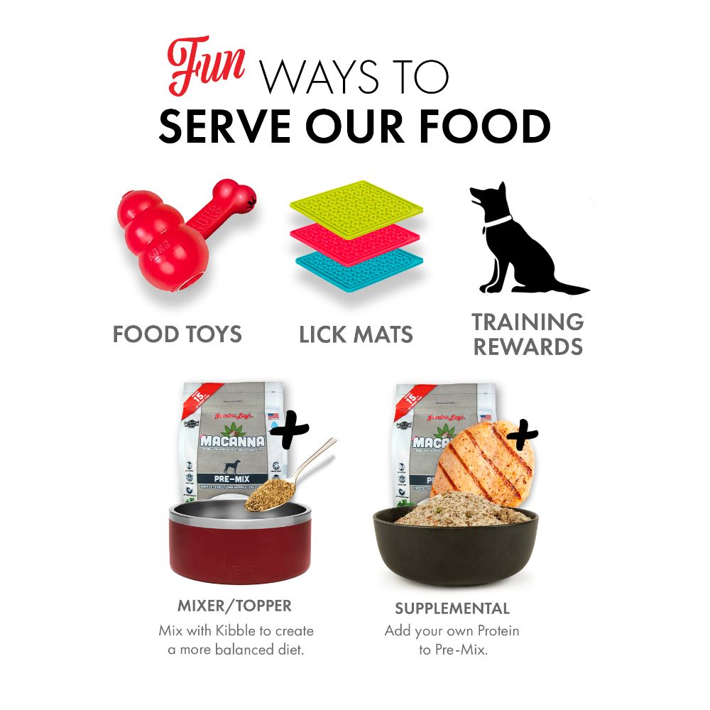 Hawaiian-inspired grain-free recipe that is great for dogs with sensitivities and our gray faced senior dogs. Macanna's unique superfood pre-mix recipe combines high-quality coconut, turmeric, and hemp to provide gentle digestive support and natural anti-inflammatory benefits. This holistic blend delivers premium nutrition that's easy on sensitive stomachs while supporting health and overall wellness, making it the perfect choice for pets.