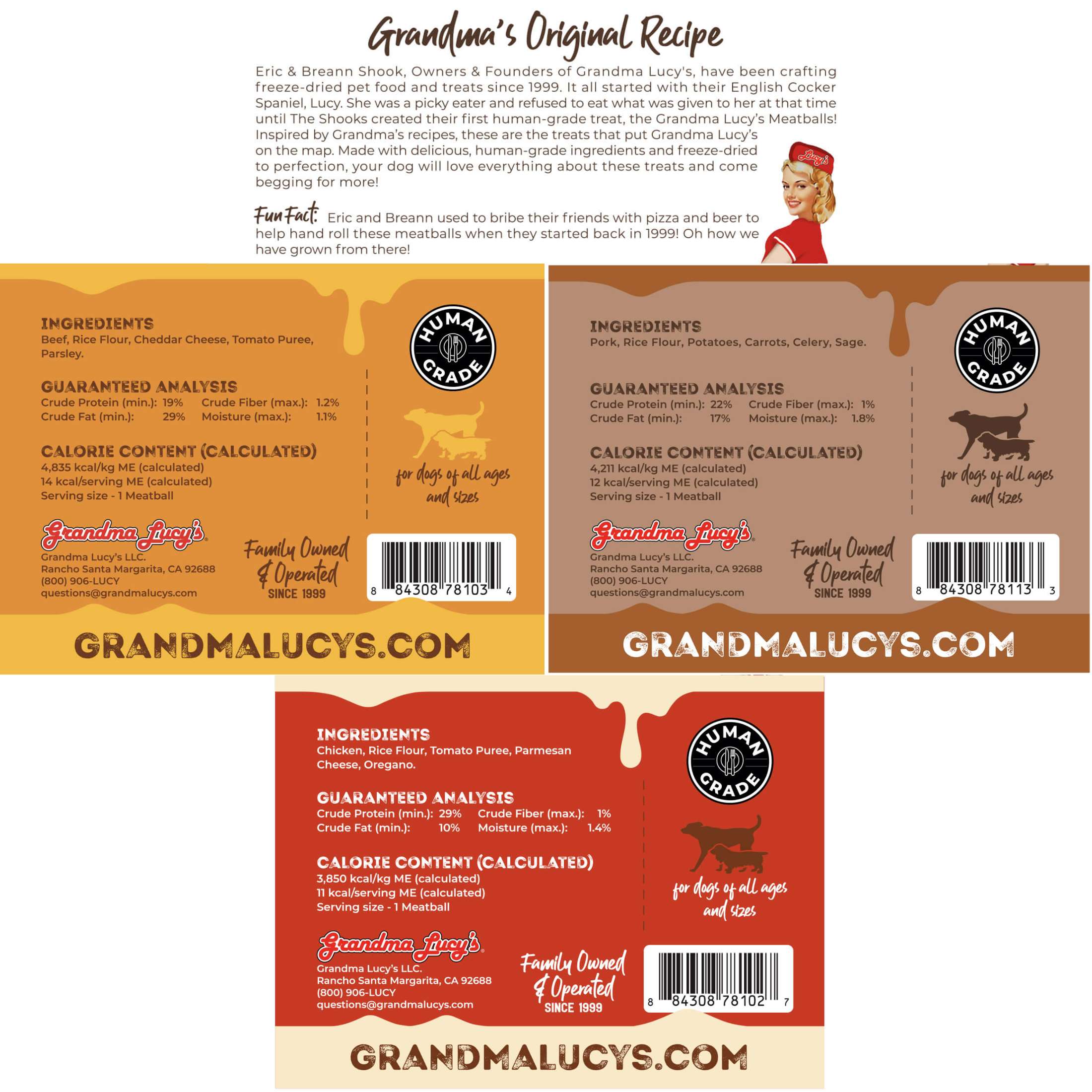 Indulge your pup with Grandma Lucy's freeze-dried meatballs, a premium dog treat that brings the warmth of home-cooked meals to your pet. These gourmet dog snacks feature wholesome, comfort food-inspired ingredients, carefully crafted to mimic the essence of a traditional family meal. Made with quality meat and a blend of nutritious vegetables like tomato or carrots and celery, complemented by aromatic herbs, these treats offer a unique and savory flavor profile your dog will crave. Our innovative freeze-drying process locks in both nutrition and taste, ensuring each meatball is a delicious high value reward. Perfect for pet parents seeking all-natural, limited-ingredient options, these grain-free dog treats are ideal for daily indulgence or training sessions. Buon appetito, furry friends!