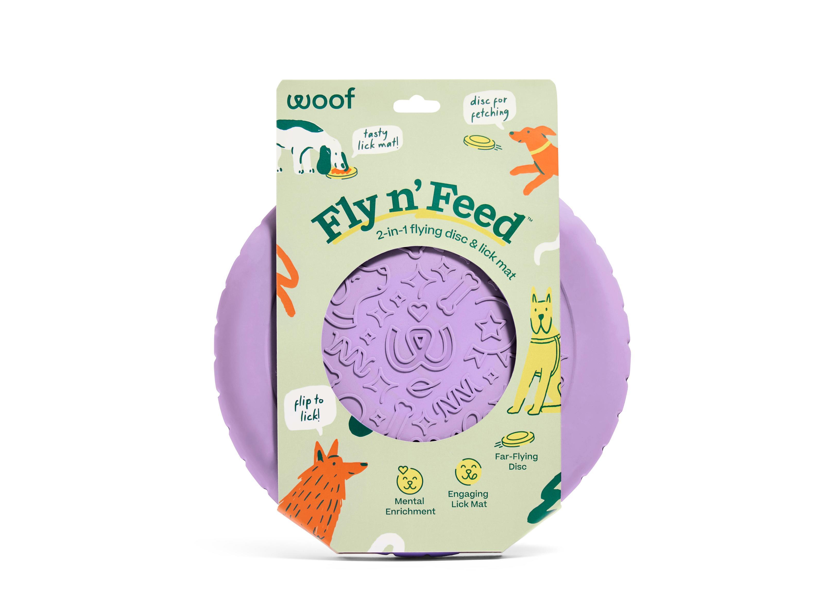 Fly n’ Feed is the flying disc with a secret superpower—it flips into a calming lick mat. Lightweight yet durable, toss for high-energy fetch, then flip to reveal dual-texture lick zones that help pups unwind after play. Rolls up for travel, pops flat for storage, and even doubles as a water dish. Made from tooth-friendly, scuff-resistant rubber and dishwasher safe. Pairs perfectly with Woof LickMix or your pup’s favorite spread.