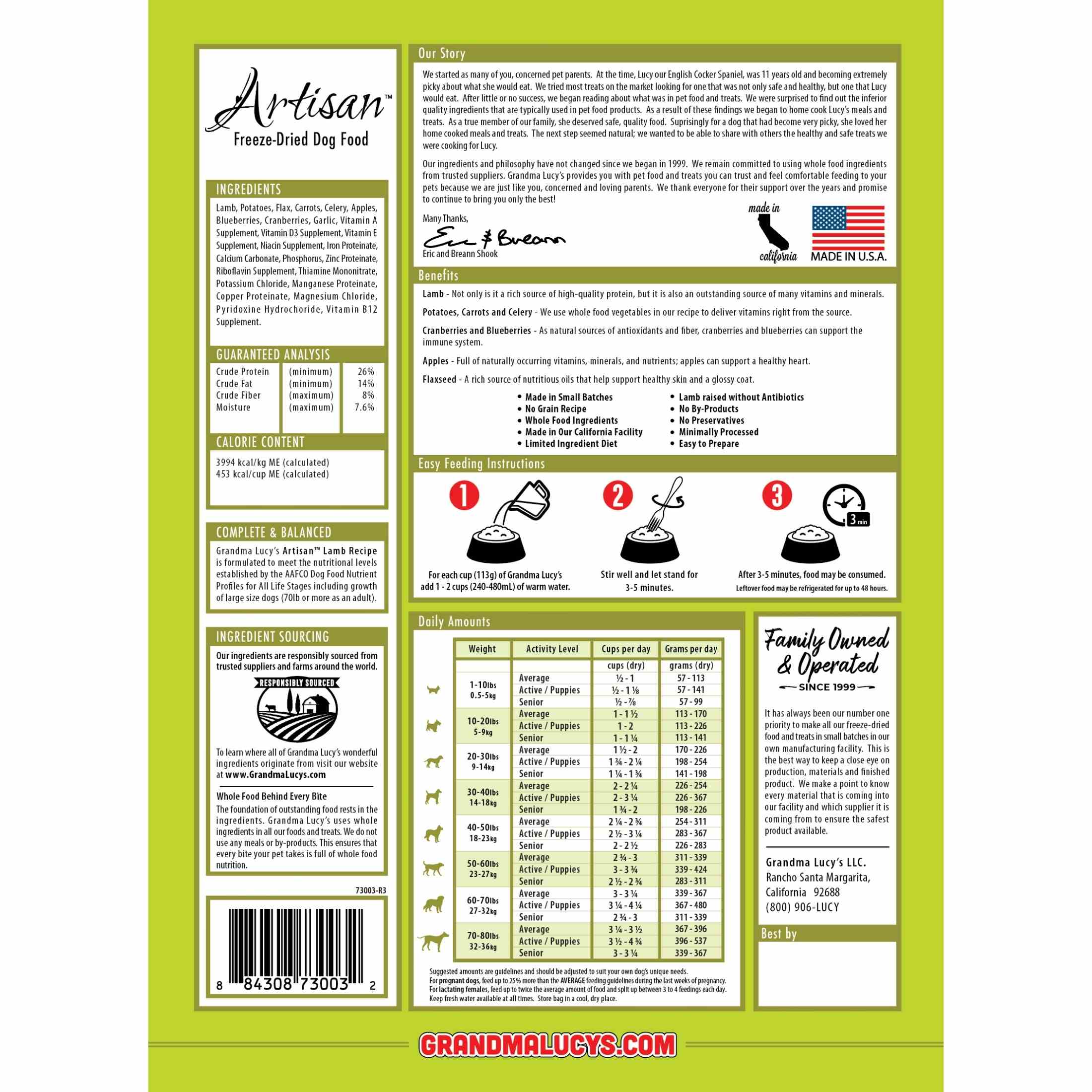 Easy to prepare, freeze dried, nutritious, complete and balanced meal, topper, or snack for your pup. Just add water to our grain-free Grandma Lucy's Aritsan Lamb and watch it transform into a hearty, stuffing like consistency within minutes. Packed with gently cooked lamb and featuring a blend of super food ingredients including flax, carrots celery, apples blueberry and cranberry. Shelf stable, lightweight, and preservative free. Fresh, wholesome nutrition made simple. Artisan, the original and best selling recipe, is a fantastic combination of digestibility and palatability making it a perfect way to introduce natural feeding into your pet’s diet. This recipe is an ideal choice for a pet with food sensitivities or a picky eater.
