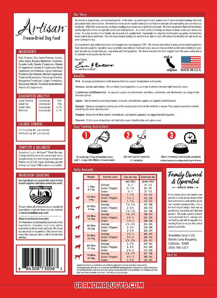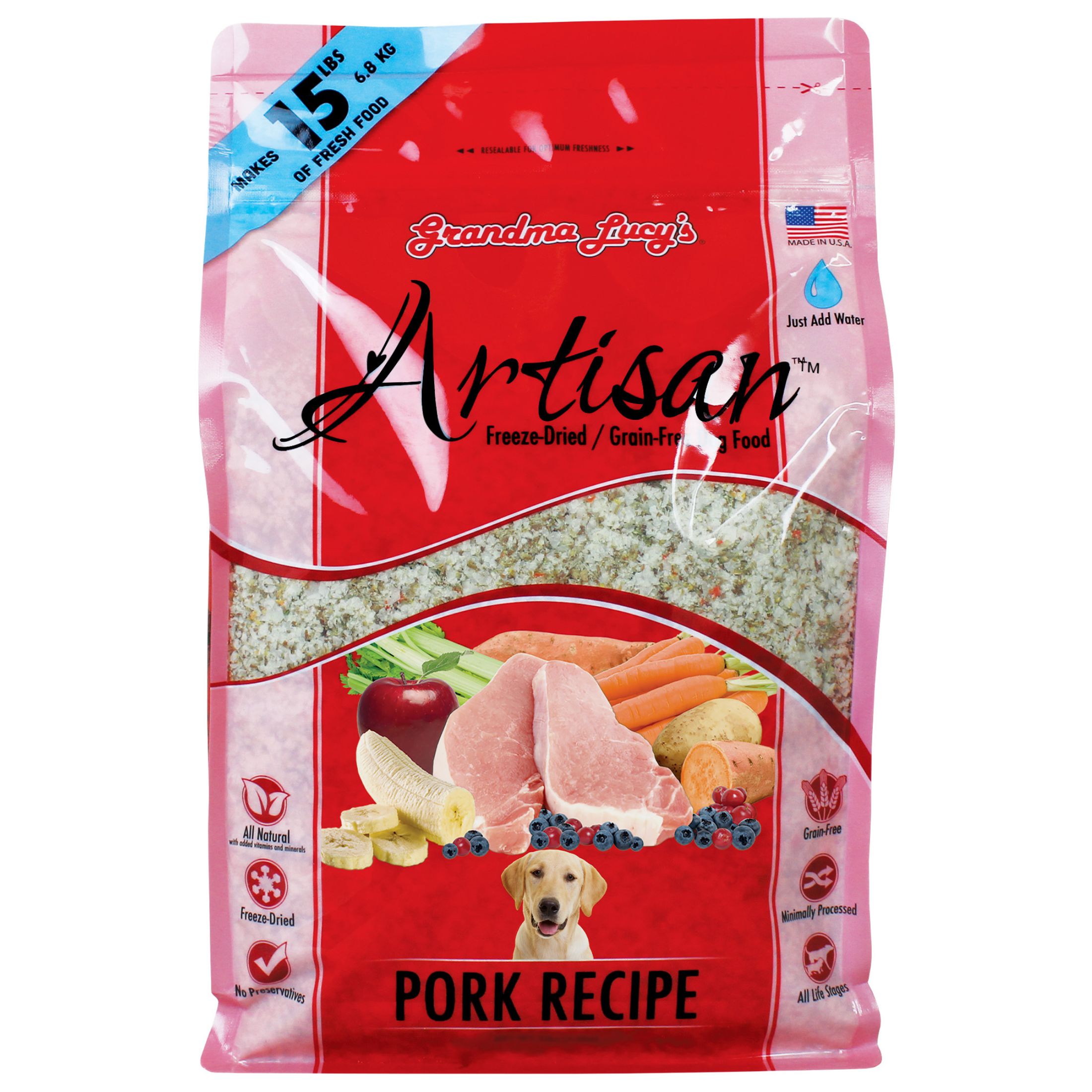 Easy to prepare, freeze dried, nutritious, complete and balanced meal, topper, or snack for your pup. Just add water to our grain-free Grandma Lucy's Aritsan Pork and watch it transform into a hearty, stuffing like consistency within minutes. Packed with gently cooked pork and featuring a blend of super food ingredients including flax, carrots celery, apples blueberry and cranberry. Shelf stable, lightweight, and preservative free. Fresh, wholesome nutrition made simple. Artisan, the original and best selling recipe, is a fantastic combination of digestibility and palatability making it a perfect way to introduce natural feeding into your pet’s diet. This recipe is an ideal choice for a pet with food sensitivities or a picky eater.