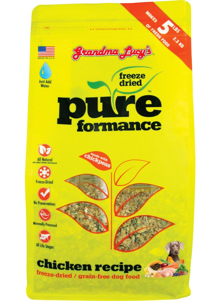 Ingredients: Chicken, Chickpeas, Flax, Carrots, Celery, Apples, Bananas, Blueberries, Cranberries, Pumpkin, Papaya, Spinach, Garlic, Vitamin A Supplement, Vitamin D3 Supplement, Vitamin E Supplement, Niacin Supplement, Iron Proteinate, Calcium Carbonate, Phosphorous, Zinc Proteinate, Riboflavin Supplement, Thiamine Mononitrate, Potassium Chloride, Manganese Proteinate, Copper Proteinate, Magnesium Chloride, Pyridoxine Hydrochloride, Vitamin B12 Supplement.