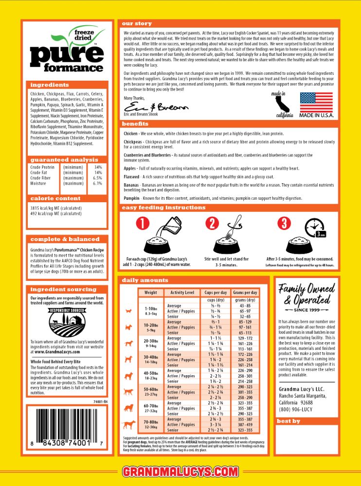 Ingredients: Chicken, Chickpeas, Flax, Carrots, Celery, Apples, Bananas, Blueberries, Cranberries, Pumpkin, Papaya, Spinach, Garlic, Vitamin A Supplement, Vitamin D3 Supplement, Vitamin E Supplement, Niacin Supplement, Iron Proteinate, Calcium Carbonate, Phosphorous, Zinc Proteinate, Riboflavin Supplement, Thiamine Mononitrate, Potassium Chloride, Manganese Proteinate, Copper Proteinate, Magnesium Chloride, Pyridoxine Hydrochloride, Vitamin B12 Supplement.