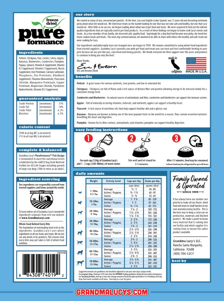 Ingredients: Pollock, Chickpeas, Flax, Carrots, Celery, Apples, Bananas, Blueberries, Cranberries, Pumpkin, Papaya, Spinach, Vitamin A Supplement, Vitamin D3 Supplement, Vitamin E Supplement, Niacin Supplement, Iron Proteinate, Calcium Carbonate, Phosphorous, Zinc Proteinate, Riboflavin Supplement, Thiamine Mononitrate, Potassium Chloride, Manganese Proteinate, Copper Proteinate, Magnesium Chloride, Pyridoxine Hydrochloride, Vitamin B12 Supplement.