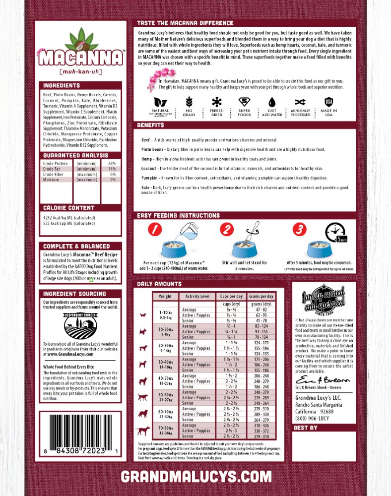 Hawaiian-inspired grain-free recipe that is great for dogs with sensitivities and our gray faced senior dogs. Macanna's unique superfood recipe combines high-quality gently cooked beef with coconut, turmeric, and hemp to provide gentle digestive support and natural anti-inflammatory benefits. This holistic blend delivers premium nutrition that's easy on sensitive stomachs while supporting health and overall wellness, making it the perfect choice for pets.